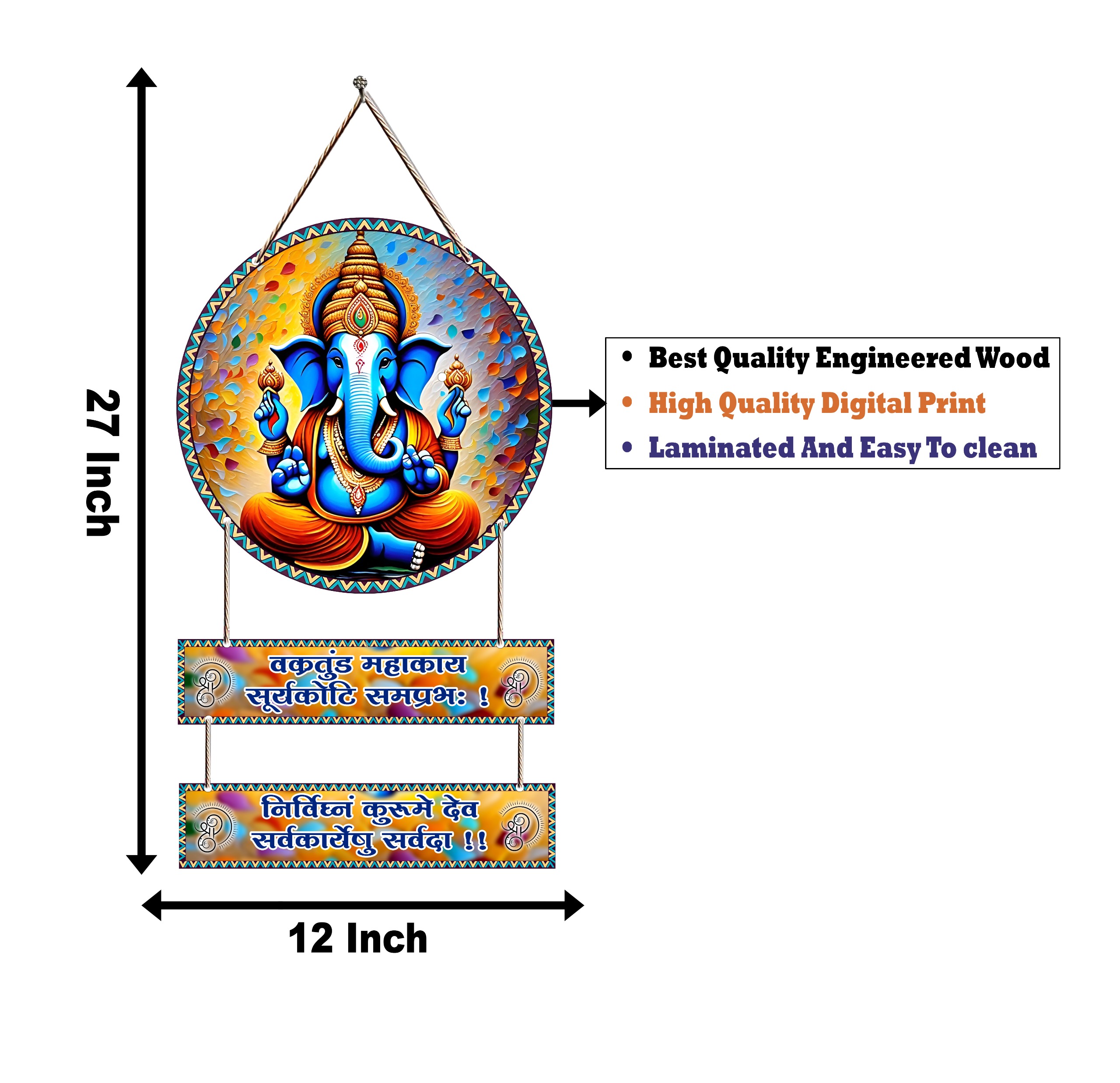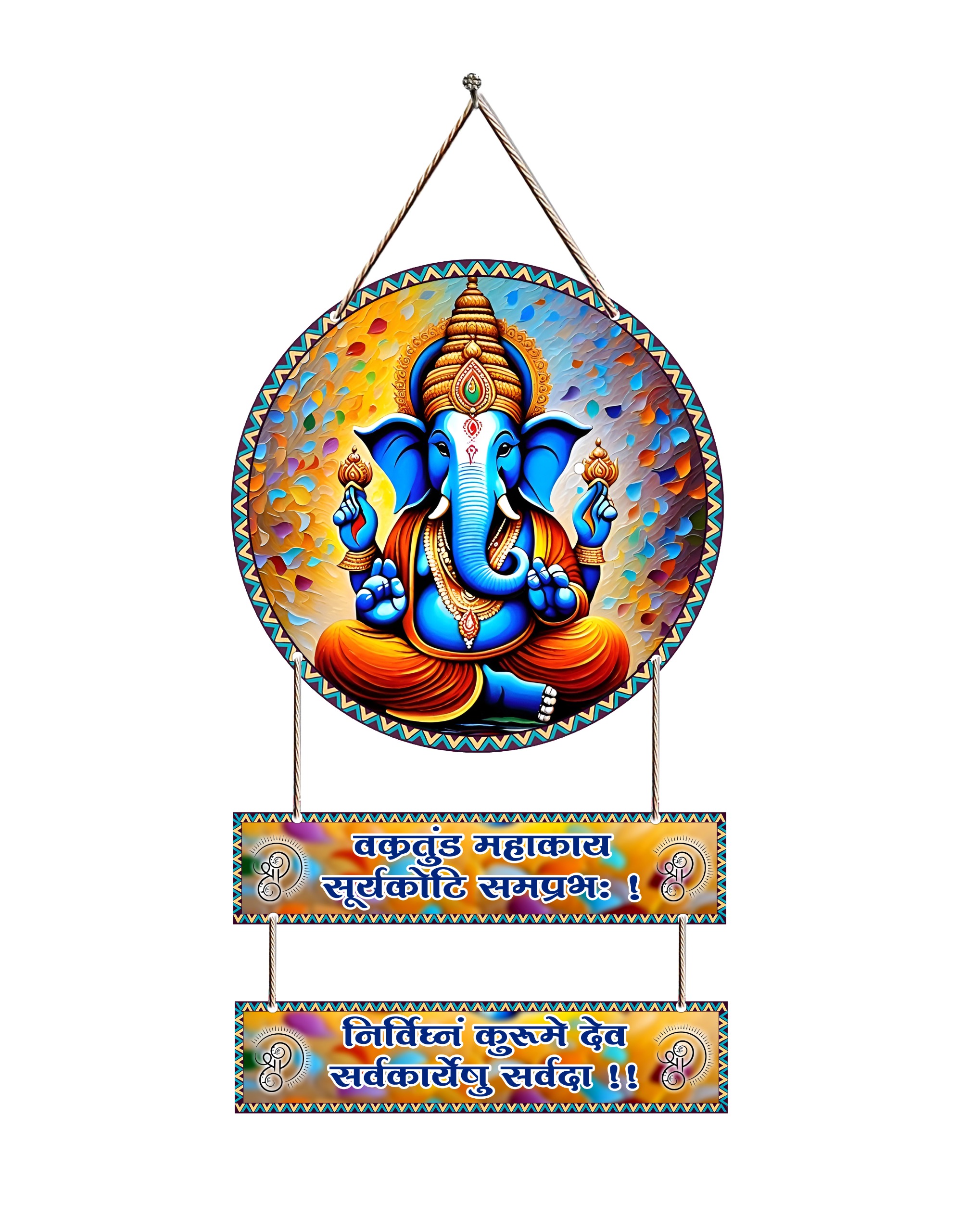 Add a touch of spirituality to your home with this beautiful Lord Ganesha hanging wall decor. Designed with divine elegance, this wall art features a stunning image of Ganpati Bappa, crafted with vibrant colors and intricate details. The attached plaques include the powerful Sanskrit mantra: