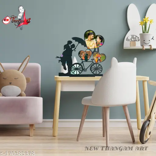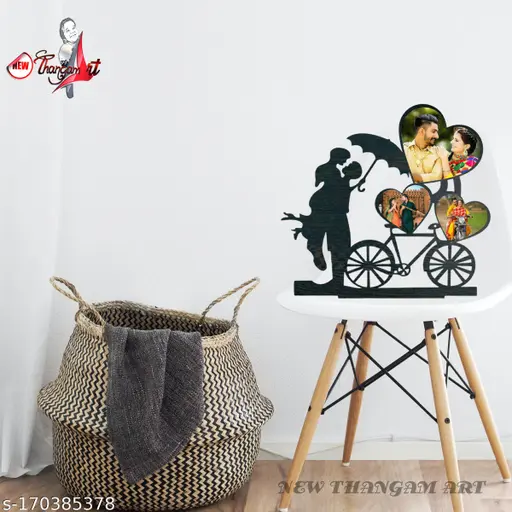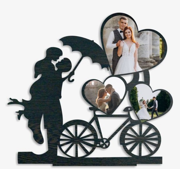 This beautifully crafted frame features a silhouette of a romantic couple under an umbrella, symbolizing love and togetherness. The bicycle-themed design adds a charming and vintage touch, making it a unique and eye-catching home décor piece. The three heart-shaped photo slots allow you to showcase your most treasured memories, making this frame a sentimental keepsake.