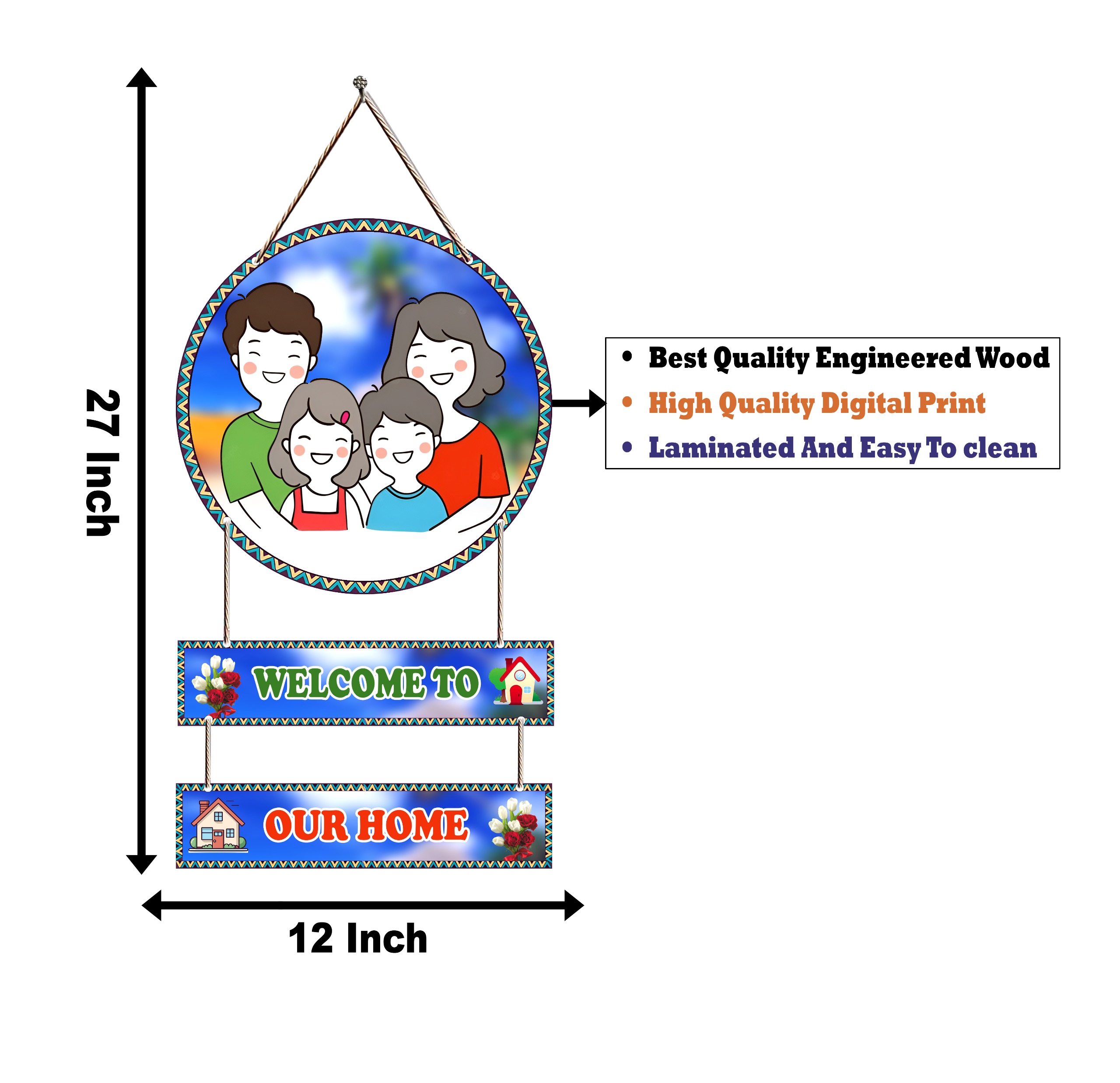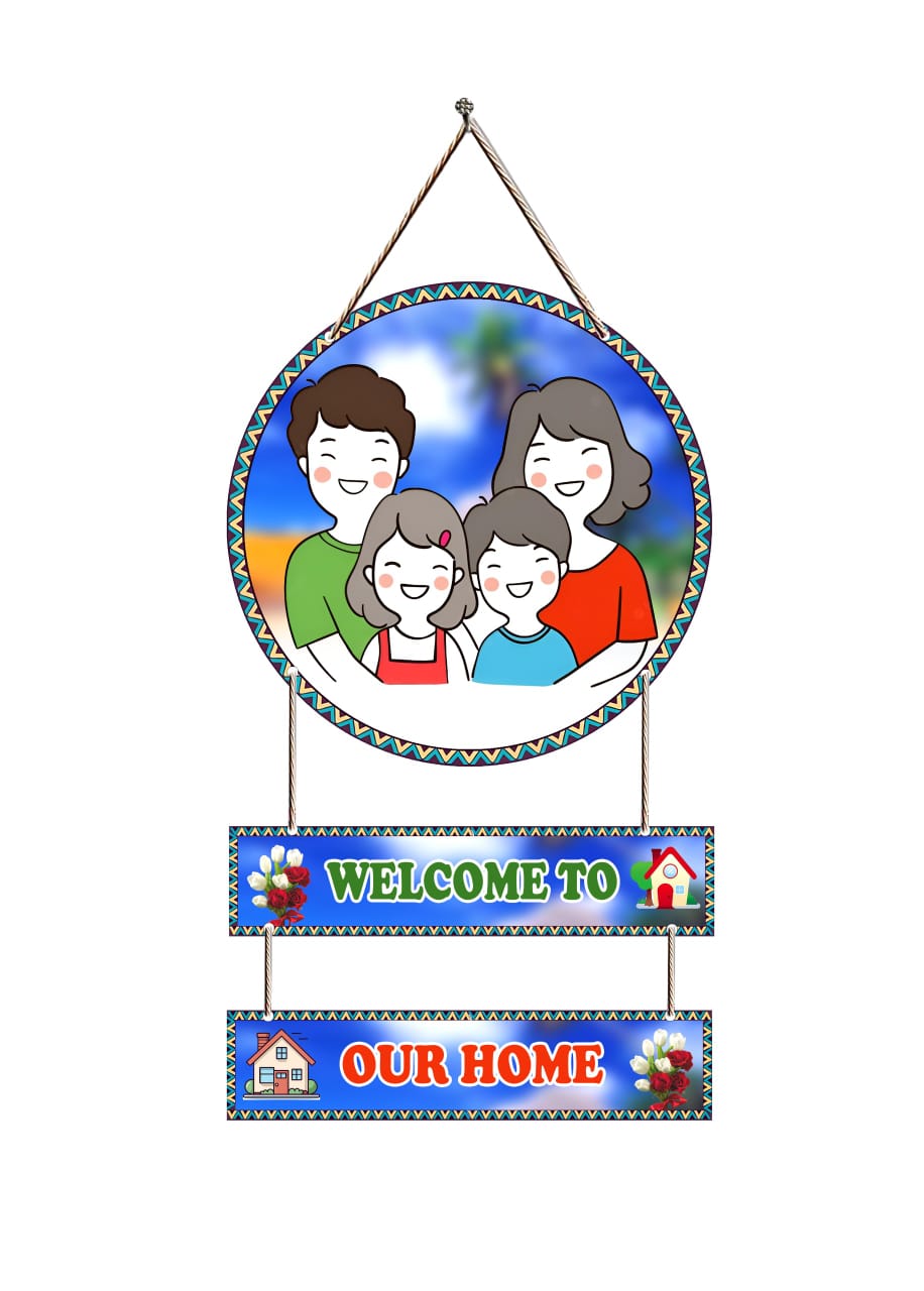 Enhance your home entrance décor with this beautifully crafted wooden hanging welcome sign. Featuring a vibrant digital print of a happy family with “WELCOME TO OUR HOME” text, this laminated nameplate is durable, easy to clean, and perfect for housewarming gifts.